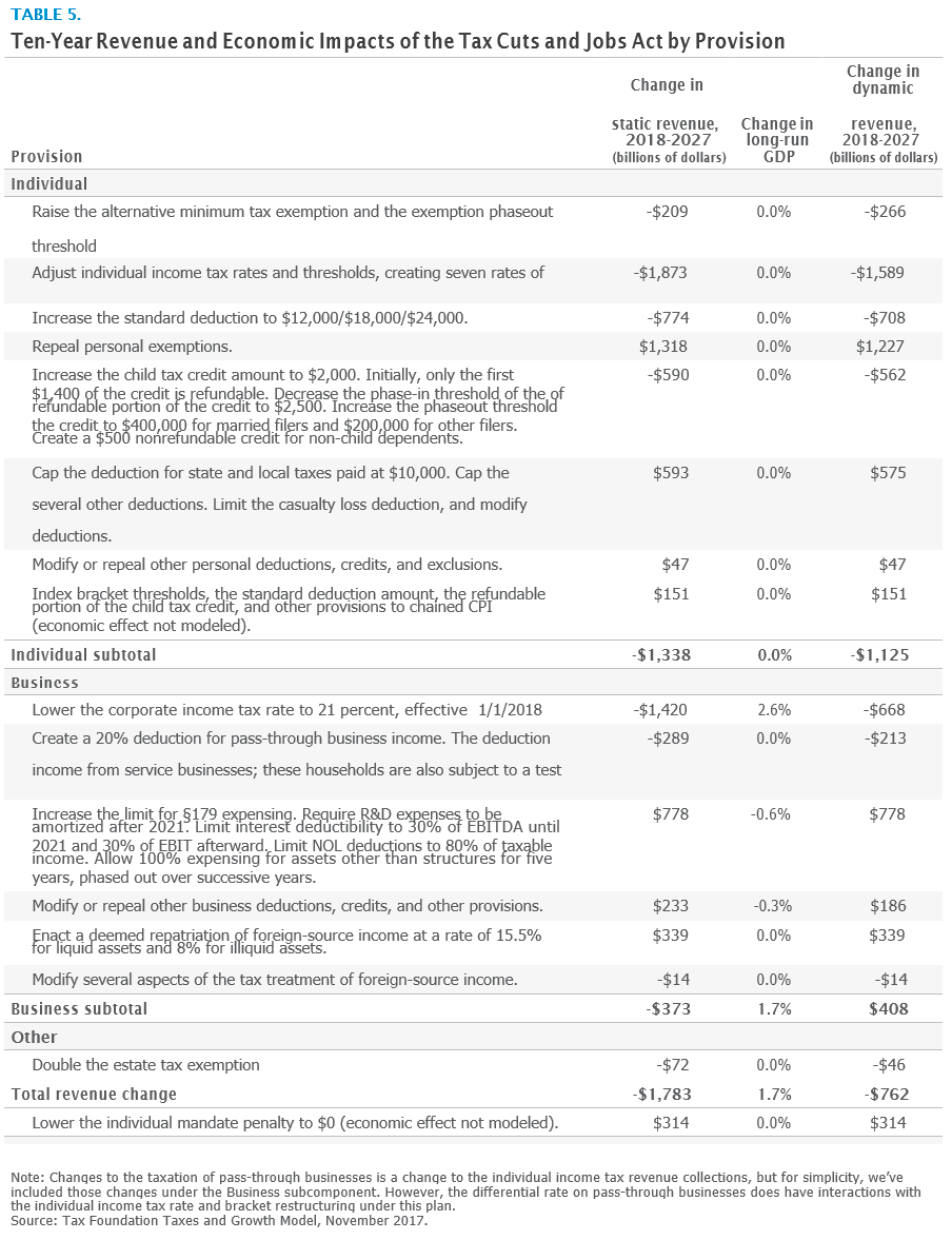 Table 5 summarizes the revenue impacts, both static and dynamic, of each of the major provisions.