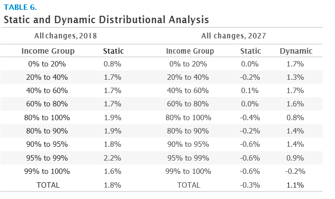 However, by 2027, the economic growth effects of the tax bill will have largely been realized. Taking these effects into account, taxpayers as a whole would see an increase in after-tax incomes of at least 1.1 percent. The bottom 80 percent of taxpayers would see their after-tax incomes increase from 0.8 to 1.7 percent. The top 1 percent of all taxpayers would see a decrease in after-tax income of -0.2 percent on a dynamic basis, largely due to chained CPI, the alternative minimum tax, and the net interest deduction limitation.